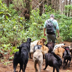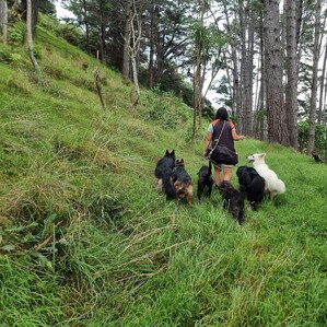 Our Pack Walks are adventure walks on private and public property. We walk in various locations, from busy suburban areas to calmer forest walks, exposing the dogs to multiple environments. We ensure new dogs get the time and attention to acclimatise to the pack on our private, 10-acre property and for our current dogs to get to know them. Variety in the environment helps build their confidence and strengthens our relationship with the pack.